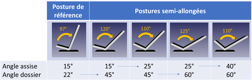 Pour ce faire, on a construit un banc d’essai constitué d’un siège de laboratoire dont on peut faire varier l’inclinaison de l’assise et du dossier, et d’une ceinture 3 points intégrée au siège, calibrée pour offrir un bon niveau de protection dans une posture classique avec un dossier redressé. Le siège est monté sur un plateau rigide auquel on va appliquer une décélération typique de choc frontal à 50 km/h.